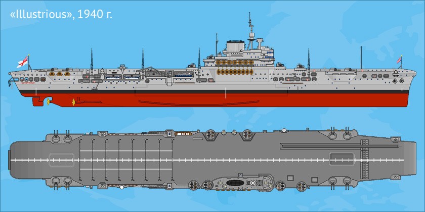 Но главное отличие – вместо двухэтажного ангара «Илластриесы» получили одноэтажный. Что ожидаемо вдвое уменьшило проектную численность авиагруппы – с 72 до всего 36 машин. Это и было платой за броню, что с бортов и оконечностей ангара составляла те же 114 мм, что и основной броневой пояс – по идее она должна была защитить от пушек эсминцев. А сверху его прикрывала та самая бронированная полётная палуба 76 мм толщиной, что теоретически должна была выдерживать 500-фунтовые [227-кг] «полубронебойные» авиабомбы как с пикировщиков, так и с более серьёзных высот.