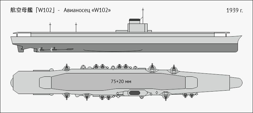 Работа над этим проектом началась ещё в конце 1937 года и сначала предполагала 27 800-тонный корабль. Минфину данный проект W102 в 1938 году впаривали уже как 28 500 тонн со скромненькой скоростью 35 узлов [64,8 км/ч] и не менее скромной авиагруппой в 96 боеготовых самолётов плюс 30 резервных. К этому присовокуплялись бронированная полётная палуба, «главный калибр» из шести 155-мм орудий, плюс шестнадцать 100-мм зениток и толпа зенитных автоматов. И всё это удовольствие всего-то на четверть дороже, чем «Сёкаку». Словом, всё это подозрительно напоминало увеличенный «Базовый проект № G-8», предшествовавший появлению «Сорю» четырьмя годами ранее. Тоже возникает вопрос, почему туда ещё и блэкджек с гейшами не попытались засунуть.