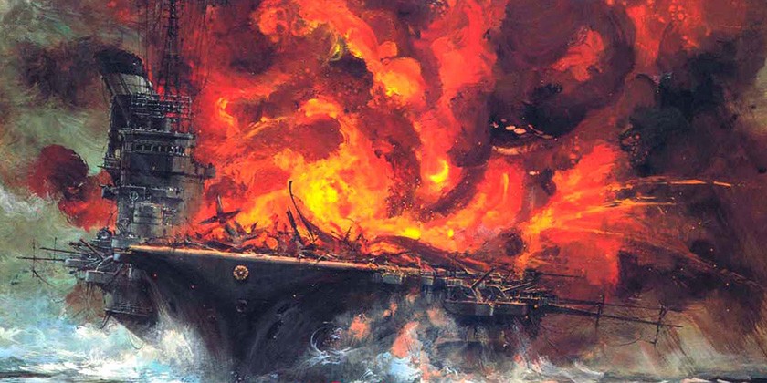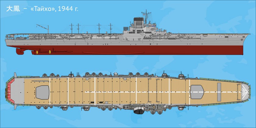 Спустя всего три месяца после вступления в строй «Тайхо» принял участие в своём первом и последнем сражении – знаменитой «Охоте на индюшек» в Филиппинском море. Где заточенный на противодействие авиабомбам корабль словил вовсе даже торпеду с американской подлодки. Повреждения и близко не были фатальными, если бы не трещины в танке с авиабензином. Ангары начали заполняться его парáми, плюс не самые грамотные действия как командования соединения и корабля, так и подразделений борьбы за живучесть… Словом, через шесть часов оно, наконец, рвануло. А как показала ранее судьба «Лексингтона», объёмный взрыв пусть в огромном, но замкнутом пространстве – это уже не лечится.