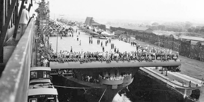 Один из авианосцев типа «Эссекс» протискивается через Панамский канал