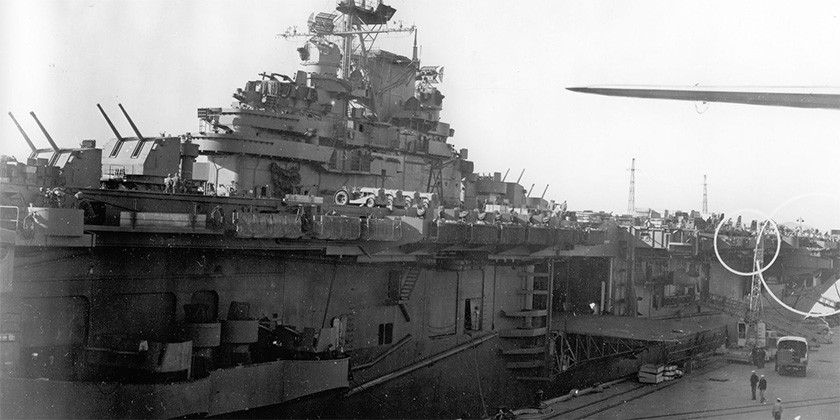 530-мм пробоина от немецкой авиабомбы в бронированной палубе «Илластриеса», 1941 год