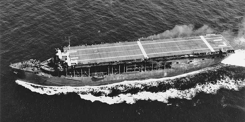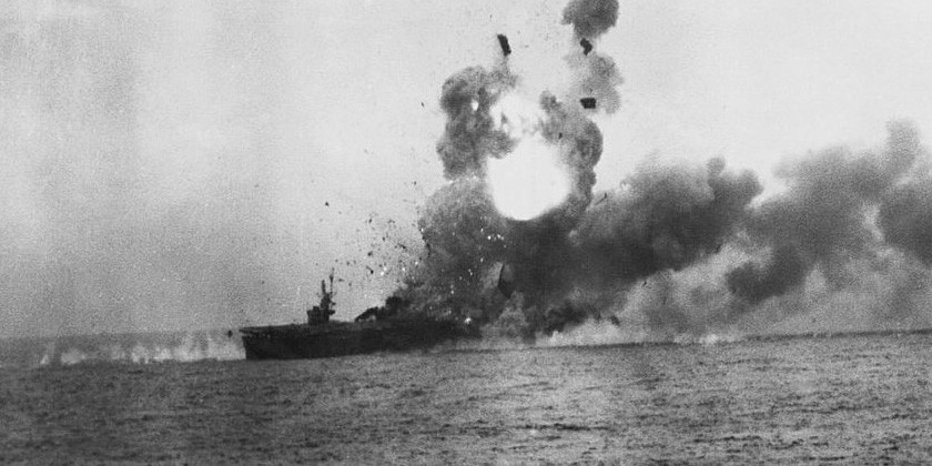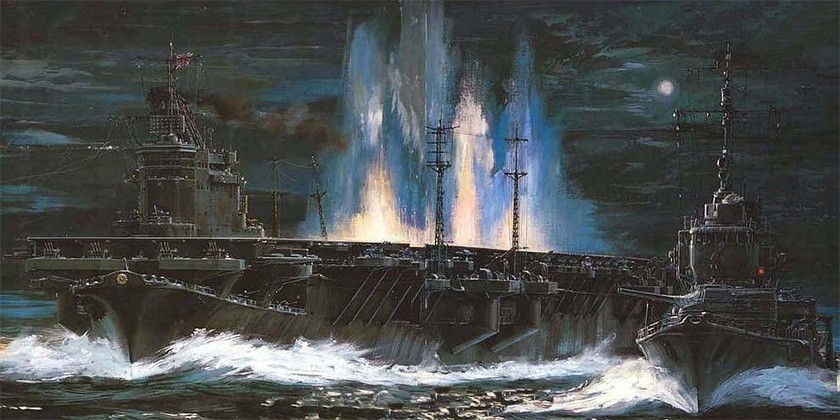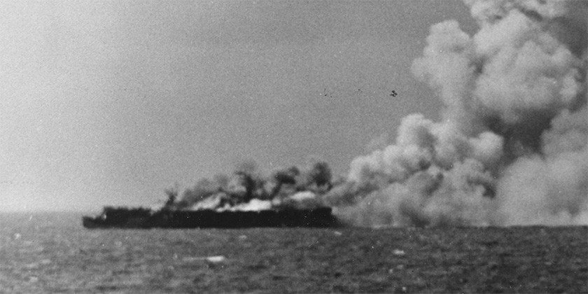 Вспомогательный авианосец «Унъё» после попаданий трёх подлодочных торпед в январе 1944-го, но потопят его лишь в сентябре того же года