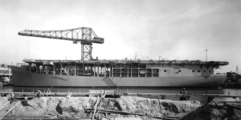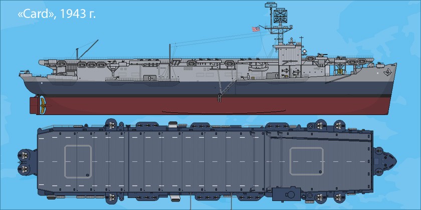 После Пёрл-Харбора и прочих катастроф начала войны до американцев быстро дошло, что если по эскадренным авианосцам они «всего лишь» серьёзно отстают от противника, то по лёгким – уже от слова «совсем». Бороться с этим отставанием начали со всем размахом широкой американской души: подсчитав все доступные корпуса типа С-3 – как достроенные, так и не очень – выдали заказ сразу на 22 эскортника, половина которых предназначалась британцам. Вторая серия из 23 кораблей строилась уже с нуля, но на базе того же проекта, и все они ушли по ленд-лизу.