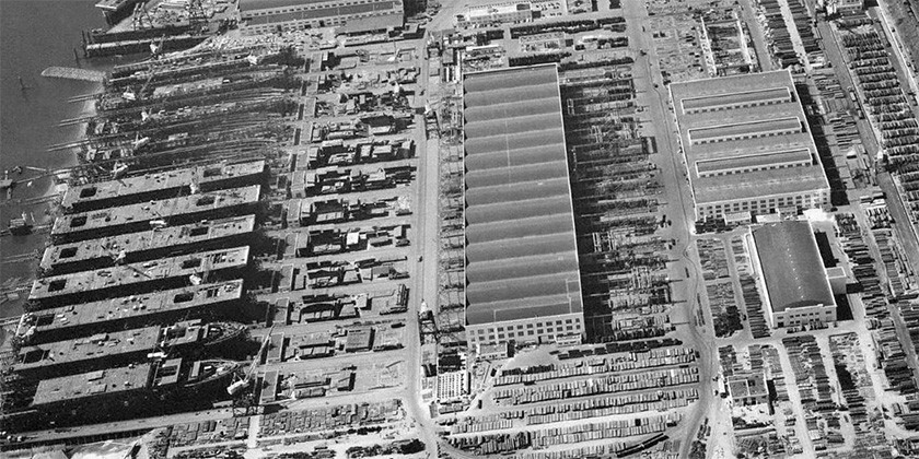 «Авианосный конвейер» в действии: одна из верфей Г. Кайзера и 12 кораблей типа «Касабланка» на стапелях в разной степени готовности, 1943 год
