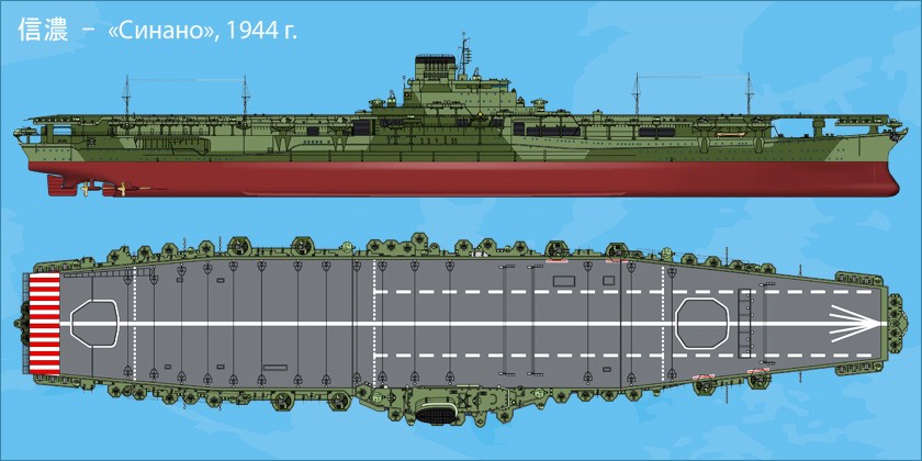 Закончить перестройку линкора планировали в апреле 1945 года, но летом 1944-го случилась ещё одна неприятность уровня Мидуэя – а может и похуже. Во время знаменитой «охоты на индюшек» у Марианских островов пошли на дно на этот раз сразу три эскадренных авианосца, включая новейший «Тайхо»; ещё два, плюс лёгкий – получили повреждения. Так что срок сдачи «Синано» волевым решением перенесли на пять месяцев «влево», на октябрь 1944 года. Со всеми вытекающими отсюда последствиями в объёмах и качестве работ.