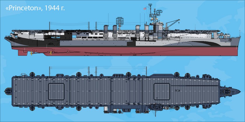 Единственный погибший корабль этого типа – CVL-23 «Принстон», 1944 год
