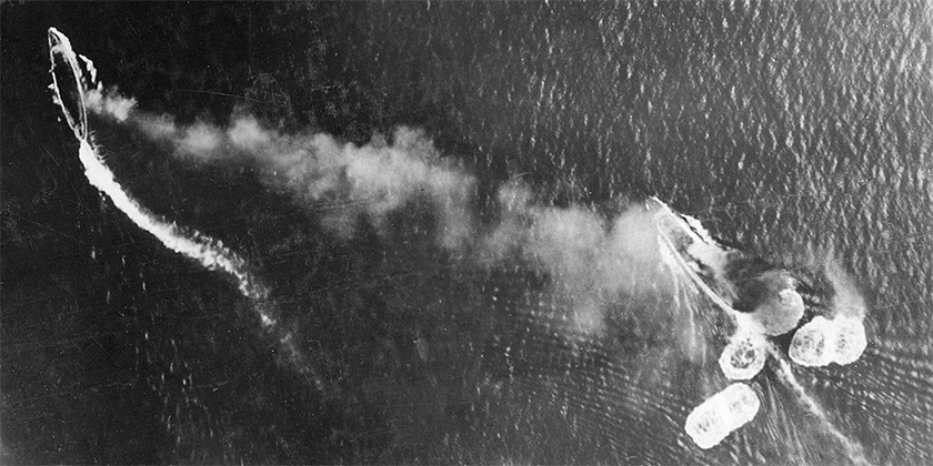 Линкор «Принс оф Уэльс» и линейный крейсер «Рипалс» под атакой японских бомбардировщиков, 10 декабря 1941 года