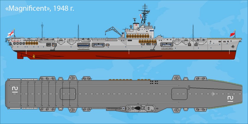 Но при этом требуемые 25 узлов [46,3 км/ч] скорости, палубная катапульта и штатная авиагруппа до 40 современных самолётов – даже немного больше, чем у гораздо более тяжёлых «Илластриесов». Хотя ангар был тоже одноярусным, а полётная палуба поменьше, с теми же двумя самолётоподъёмниками. Но вот зенитное вооружение было гораздо слабей – только ближний радиус. На первых ставили лишь шесть счетверённых 40-мм «Пом-помов» и 32 ствола 20-мм «Эрликонов», что на конец войны было уже откровенно маловато.