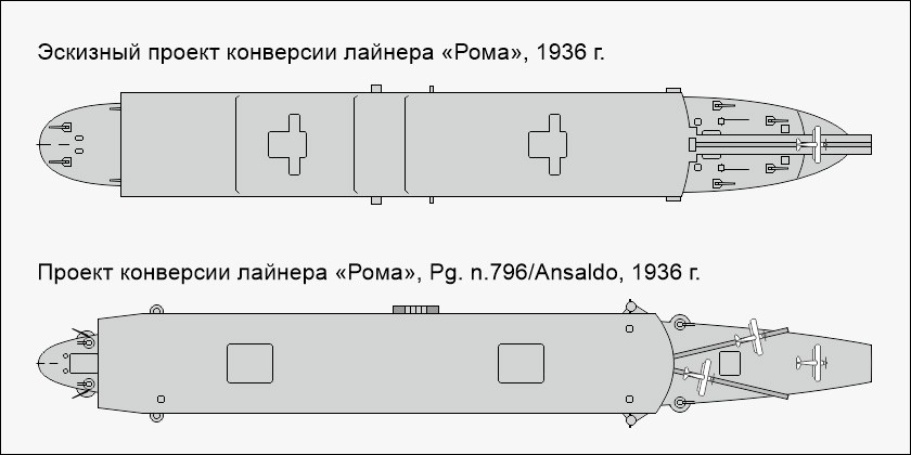 С самого начала было ясно, что авианосец специальной постройки – это долго. Серьёзно обсуждалась лишь быстрая перестройка из гражданского судна. И почти сразу определили «донора» – лайнер «Рома». Предварительным вариантом конверсии был корабль с посадочной палубой и узкой платформой катапульты в носу. А вторым – самый, наверное, осмысленный проект «двухпалубного» авианосца в истории. На коротенькой нижней «взлётной» палубе там имелась пара интегрированных в неё катапульт – так что, в отличие от британских или японских «многопалубников», с неё можно было бы взлетать как своим ходом, так и с помощью «живительного пенделя».