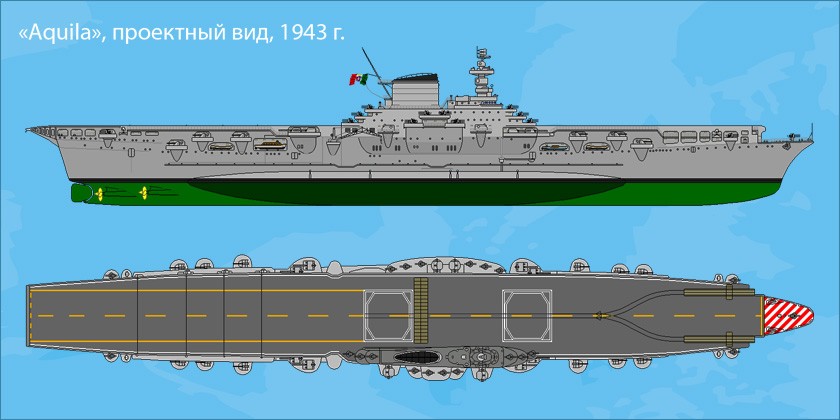 Энергетическая установка лайнера всё это, естественно, не тянула, так что её заменили комплектами котлов и турбин, уже построенных для пары отменённых лёгких крейсеров. По идее, каждый из комплектов был рассчитан на 110 000 лс, так что получивший имя «Аквила» (Орёл) корабль мог стать самым энерговооружённым авианосцем Второй Мировой. Но их максимальную мощность ограничили, так что в сумме получились требуемые для 30 узлов 151 000 лс. Что тоже нехило – на уровне американских «Эссексов» или, скажем, суперлинкоров типа «Ямато».