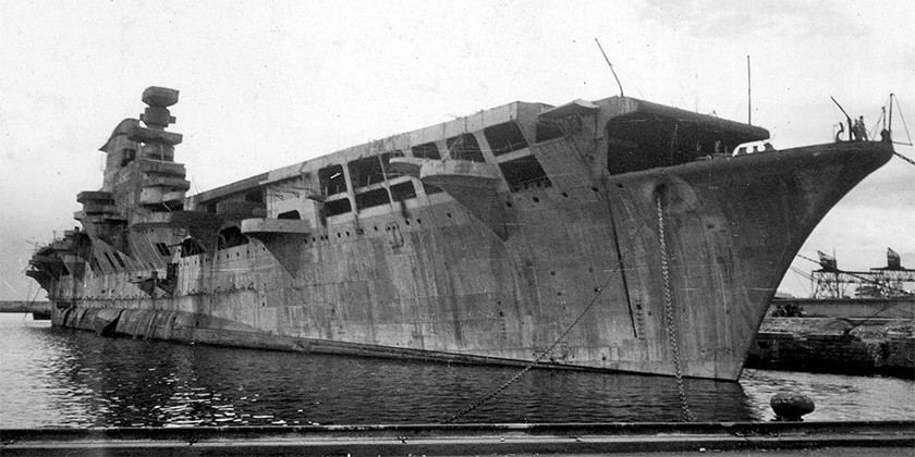Но ещё печальней было с авиагруппой. В ударные машины со складывающимися плоскостями ВВС так и не смогли, так что в конце концов решили, что все задачи будет решать один самолёт – одновременно истребитель, пикировщик и даже торпедоносец. Одноместная машина с движком 1500 лс и вооружением из пары 12,7-мм пулемётов. Но даже их не осилили. Авиагруппа должна была состоять из 51 машины, из них построили лишь десять, а вариант, доработанный под подвеску торпеды, так и остался в единственном экземпляре. Словом, «практически достроенный авианосец» без зениток, посадочного оборудования и даже авиагруппы имел скорей отрицательную боевую ценность.