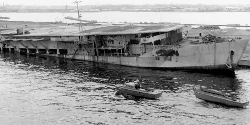 Полузатопленный эскортный авианосец-танкер «Ямасио-мару», август 1945 года