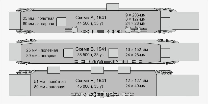 В результате к середине 1941 года они разработали десяток эскизных проектов разной степени упоротости. Задача была поставлена предельно скромная – авиагруппа в 110-130 самолётов, скорость 33 узла [61 км/ч] и бронирование не только ангарной, как на «Эссексах», но и полётной палубы. Не то, чтобы их сильно покусали британцы – бронепалубы рассматривались ещё в 1931 году при проектировании «Йорктаунов» – но какое-то воздействие уже испытанный в бою британский «Илластриес», конечно, оказал.