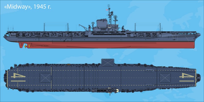 Зато корабли получили полётные палубы рекордной длины 281,6 метра и площадью чуть меньше гектара. Это позволило установить две улучшенные – с удлиннённым треком – палубные катапульты в носу. А вкупе с увеличенным ангаром – даже перекрыть техзадание по самолётам. Первая авиагруппа «Мидуэя» начитывала 136 машин образца 1945 года. Могло быть и больше, но идею сделать все три самолётоподъёмника бортовыми сочли слишком радикальной и оставили ту же схему, что и на «Эссексах» – бортовой только центральный, а носовой и кормовой – обычные палубные.