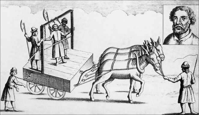 В прошлую пятницу 1000 мушкетеров-стрельцов доставили его сюда, и сегодня за два часа до того, как я это пишу, он был наказан по заслугам. Его поставили на специально сколоченную по такому случаю повозку семи футов вышиной: там Разин стоял так, что все люди – а их собралось более 100 000 – могли его видеть.