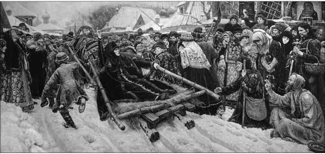 Это был прямой вызов, и Алексей Михайлович принял его как личное оскорбление. 16 ноября 1671 г. ее вместе с сестрой арестовали, а через несколько дней повезли на допрос в Чудов монастырь. Именно этот момент изображен на картине В.И. Сурикова: проезд мимо царского дворца.