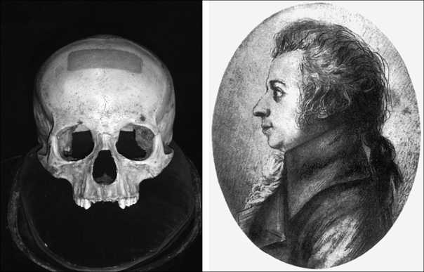 Предполагаемый череп Моцарта и его портрет работы Доротеи Шток