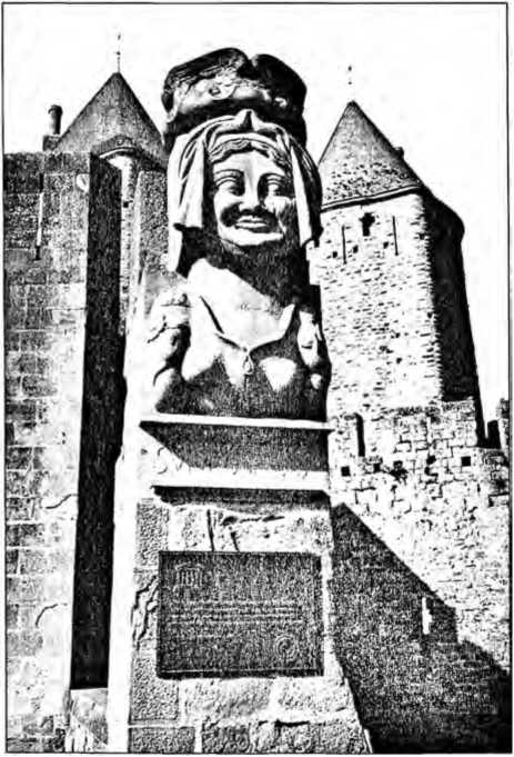 Именно с сарацинами связано много легенд о цитадели. Одна из них касается Карла Великого, который в течение пяти лет осаждал крепость, пытаясь уморить город голодом. По легенде, супруга мусульманского царя Балаака, прозванная Дамой Каркас, после того, как практически все защитники города умерли от голода, защищала крепость в одиночку. Она смастерила с десяток кукол-солдат и в течение нескольких дней обстреливала позиции штурмующих. Напоследок скормила оставшееся зерно последней свинье, которую и сбросила к подножию башни. Живот свиньи лопнул, и воины увидели зерно. Карл Великий был ошеломлен этим и приказал снять осаду с города. Дама Каркас была вне себя от радости. Она приказала звонить в колокол, тем самым поддразнивая франков и их императора. Карл не слышал этих победных звуков, но его оруженосец сказал ему: «Сир, Каркас звонит» («Sire, Carcassonne»). Так, по легенде, родилось название крепости – Каркассон. Правда, неясно, как в осажденном городе сохранились зерно и свинья? Так или иначе, но сегодня бюст Дамы Каркас красуется на одной из колонн моста перед Нарбоннскими воротами.