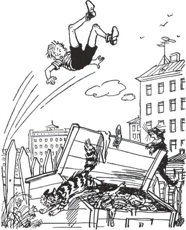Промелькнув по двору с быстротой молнии, Толя выехал на задворки и со всего разгона наткнулся передним колесом на толстую чугунную тумбу, которая лежала недалеко от забора. От удара велосипед брыкнул, словно лошадь, и встал торчком. Толя выскочил из седла, перелетел вверх ногами через забор, как акробат в цирке, и шлепнулся в мусорный ящик, который стоял в соседнем дворе под забором.