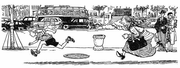 Встречные пешеходы останавливались, не зная, надо им ловить Толю или не надо. Один гражданин хотел было его схватить, но Толя ловко шмыгнул у него под рукой и, повернув с тротуара, помчался по мостовой. Здесь ему не угрожали встречные пешеходы и он мог развить гораздо большую скорость. Дарья Семеновна тоже побежала по мостовой, но тут же чуть не угодила под грузовую машину.