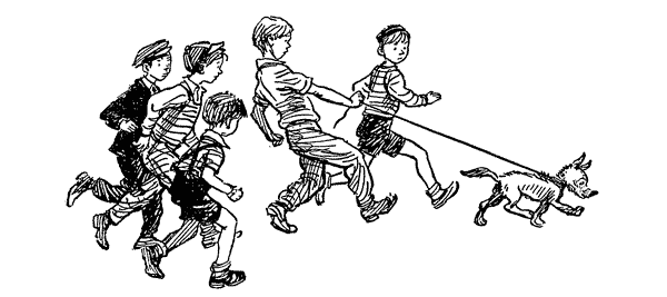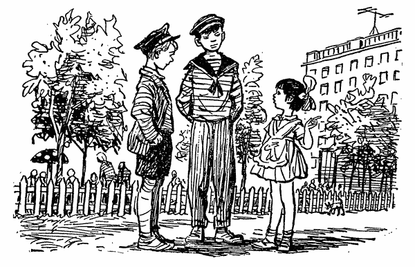 Вдруг она увидела, что в ворота вбежали два незнакомых мальчика. Один из них был в длинных брюках и синей матросской куртке, другой – в коричневом костюме с коротенькими штанами. Ботинки у него на ногах были не чёрные, а какие-то рыжие, потому что он всегда забывал их почистить.