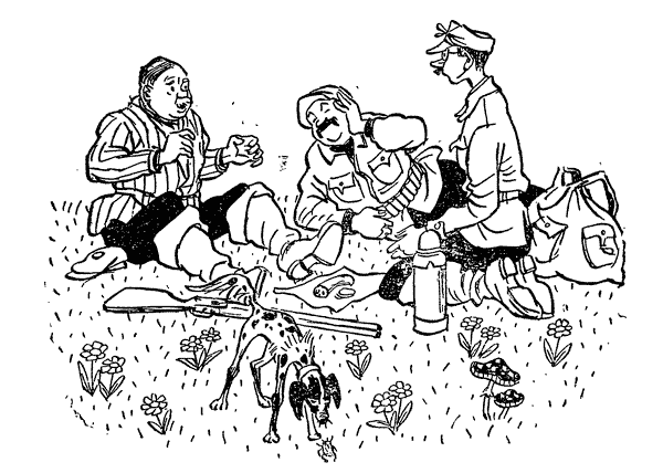 Жили-были три весёлых охотника: дядя Ваня, дядя Федя да дядя Кузьма. Вот пошли они в лес. Ходили, ходили, много разных зверушек видели, но никого не убили. И решили устроить привал: отдохнуть, значит. Уселись на зелёной лужайке и стали рассказывать друг другу разные интересные случаи.