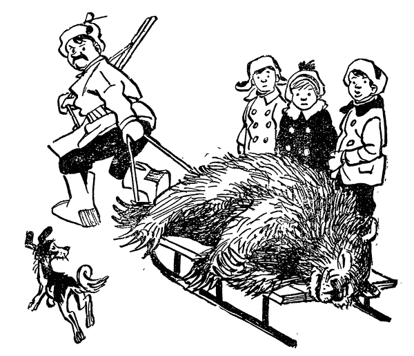 – Я тоже однажды медведя встретил. Это было зимой. Пошёл я в лес. Гляжу – медведь. Я бах из ружья. А медведь брык на землю. Я положил его на санки и повёз домой. Тащу его по деревне на санках. Тяжело. Спасибо, деревенские ребятишки помогли мне его довезти до дома.