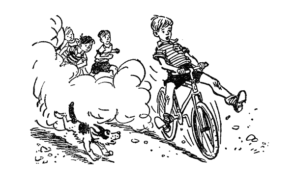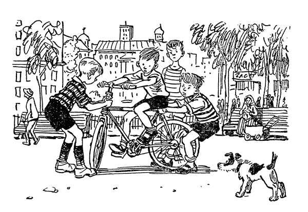 Ребят было четверо, но ни один из них ещё не умел кататься, поэтому они не столько ездили, сколько падали с велосипеда. Нужно сказать, что кататься на этом велосипеде без привычки было довольно трудно, так как он был не совсем обычной конструкции. На обычном двухколёсном велосипеде педали надо крутить только до тех пор, пока машина не разгонится, после чего велосипед едет сам, а педали стоят на месте. На этом же велосипеде педали надо было крутить всё время. Даже когда их можно было уже и не крутить, они сами крутились. Это, наверное, объяснялось тем, что велосипед был устаревшей системы. Его подарил ребятам один жилец, который жил в их доме.