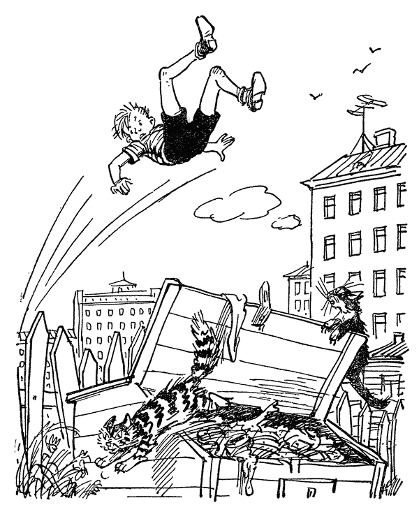 Промелькнув по двору с быстротой молнии, Толя выехал на задворки и со всего разгона наткнулся передним колесом на толстую чугунную тумбу, которая лежала недалеко от забора. От удара велосипед брыкнул, словно лошадь, и встал торчком. Толя выскочил из седла, перелетел вверх ногами через забор, как акробат в цирке, и шлёпнулся в мусорный ящик, который стоял в соседнем дворе под забором.