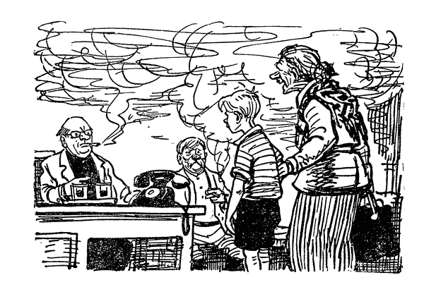 Старуха потащила Толю в домоуправление. Там сидели управдом и счетовод. Управдом что-то писал за столом. Счетовод что-то подсчитывал на арифмометре. Он при этом курил, не выпуская изо рта папиросу, и жмурился от попадавшего в глаза дыма.