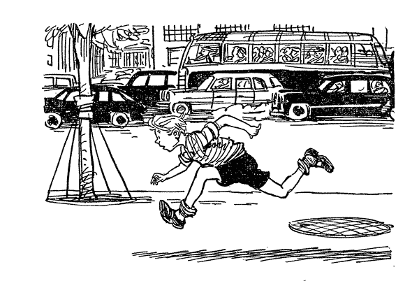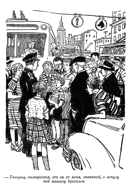 Но Толя не слушал её. Он выбежал на перекрёсток и понёсся через дорогу. Дарья Семёновна увидела мчавшийся наперерез Толе трамвай и остановилась на углу улицы. Внутри у неё всё похолодело. Ей казалось, что Толя вот-вот угодит под трамвай. Но вагоновожатый, увидав Толю, замедлил ход. Толя перебежал через рельсы, но с другой стороны к нему уже приближался автомобиль. Бежать назад было поздно. Раздался визг тормозов. Автомобиль ткнул Толю в плечо и тут же остановился. Толя упал. Дарья Семёновна уронила на землю сумку и закрыла лицо руками.