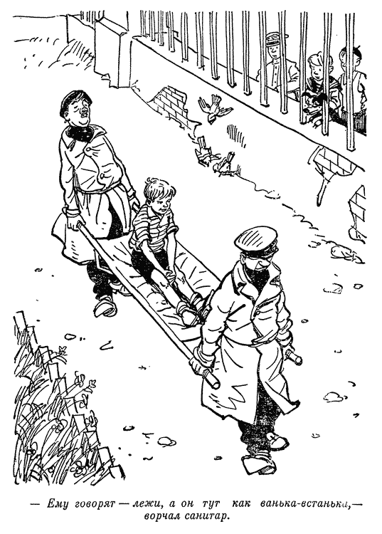 И они понесли Толю в больницу. Толе, однако, хотелось видеть, куда это его несут, и, вместо того чтоб спокойно лежать, он сидел на носилках и вертел во все стороны головой.