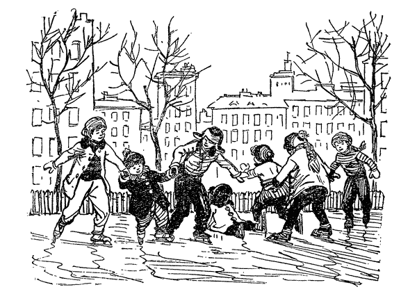 Все, как по команде, бросились на лёд, и пошло катание. Катались и на коньках и без коньков. Все смеялись и падали. Коньки звенели и с шипением резали лёд. Катались даже те, которые не строили катка, но мы им не запрещали. Хотелось, чтоб в такой день все были радостные и счастливые. Даже взрослые вышли во двор и смотрели на наше веселье. А управдом Дмитрий Савельевич тоже пришёл и сказал:
