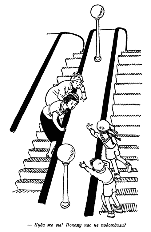 Стали осматривать станцию, а там лестница движется. Люди по ней вверх и вниз едут. Стали и мы кататься: вверх и вниз, вверх и вниз… Ходить совсем не надо, лестница сама возит.