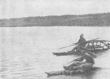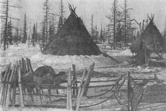 На другой день пришел Тынка на оленях с упряжкой для меня и, пожелав успеха оставшимся, мы незамедлительно тронулись в путь, рассчитывая попасть в Дудинку за один переход. Но не тут-то было. Погода стала портиться, начал накрапывать дождь при холодном северо-западном ветре. Постепенно он разошелся и превратился нудный мелкий непрерывный дождь. Ехать стало тяжело. Дождь и ветер секли лицо, вода лилась за воротник, и к Амбарной мы вымокли насквозь, хотя на мне был кожаный костюм, полушубок и брезентовый плащ. У Василия тоже был полушубок и плащ да своя замшевая камлейка. Стали выбиваться из сил тоже вымокшие олени. Пришлось остановиться у найденного моховища, куда пустили на привязи оленей. Расстелили взятый с собой брезент, другой его половинкой накрылись и так продремали ночь под шум стучавшего по нашей задубелой крыше дождя, пока хоть немного отдохнули и подкормились олени. В Дудинку приехали на другой день вконец измученные. Елизавета Ивановна нас встретила радостно, дала переодеться в сухое, накормила и напоила на славу. Тынка был настолько утомлен, что нам его пришлось сводить под руки вниз, под яр, где у берега стоял его чум.