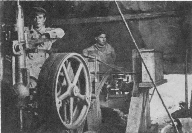 Встал вопрос о приводном ремне. Сыромять для этого не годится, а более прочной кожи типа подошвенной ни у нас, ни в Дудинке нет. Решили попробовать сплести ремень из шнура, который идет для насадки полотен рыболовных сетей. Его по факториям везде достаточно. Максим Щукин взялся это сделать на Часовне, где ремень сплетут долганки, его родственницы. Шкив на маховик мотора изготовил Богач. Он уехал в Дудинку, собрал там шкив из сухих ящичных досок, расточил его на токарном станке в радиостанции, скрепил с маховиком болтами, отцентрировал и сбалансировал. Через несколько дней все было готово. Ремень сплели очень искусно и прочно, так как Максим знал, для чего он нужен. Мотор собрали, поставили в станок и отцентрировали по шкиву бурового станка. Теперь можно пробовать всю установку. Хороший бензин и масло для мотора есть и у нас, и на радиостанции в Дудинке. Заводить мотор придется от бурового станка вхолостую, так как пусковой ручки у мотора теперь нет. Натянули приводной ремень, Максим закрутил ручку станка, я подкачал в карбюратор бензин, и мотор, раза два дав вспышку, заработал, станок пошел в ход. Это было всеобщее торжество. Осторожно рычагом опустили коронку на забой, Щукин принялся начать насос, и слышно было, как зашуршала, заработала коронка. Манипулируя рычагом, стали пробовать вести бурение на различных режимах нагрузки: при нормальной – мотор хотя и с трудом, но тянул, а как только ее увеличивали, он глох. Конечно, 5 сил для такого станка, как «Вирт», это мало. Но будем осторожны и не станем форсировать проходку. Прокачку воды насосом через штанги в забой придется вести, конечно, вручную.