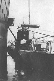 Погрузка торпед на подводную лодку «С-31» с плавбазы «Волга»