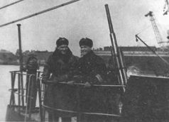 На борту лодки «С-31» комдив капитан 2-го ранга Н.Д. Новиков и комиссар бригады подводных лодок капитан 1-го ранга В.И. Обидин. Декабрь 1942 г.