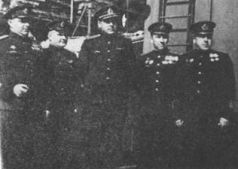 День Победы: капитан 2-го ранга Н.Д. Новиков, капитан 3-го ранга П.И. Замятин, капитан 1-го ранга С.Е. Чурсин, капитан 3-го ранга Н.П. Белоруков, капитан 2-го ранга Б. Плахин. 9 мая 1945 г.