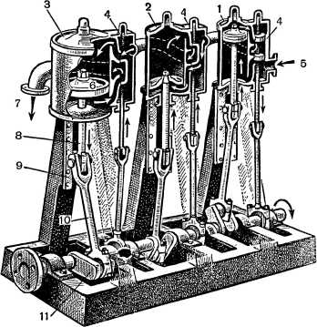 Паровая машина с тройным расширением пара. 1 – цилиндр высокого давления; 2 – цилиндр среднего давления; 8 – цилиндр низкого давления, 4 – золотниковые коробки; 5 – подвод пара; 6 – поршень; 7 – отвод пара в конденсатор; 8 – шток; 9 – параллели; 10 – шатун; 11 – коленчатый вал.