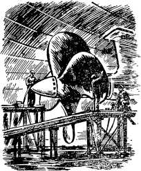 Такой двигатель с постоянно действующим паром, названный паровой турбиной, был создан в конце прошлого столетия. В этом двигателе, делающем несколько тысяч оборотов в минуту, пар мчится в 40 раз быстрее, чем в паровой машине.