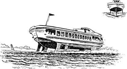 К таким устройствам относятся, например, подводные крылья. На заводе «Красное Сормово» в Горьком уже построен катер «Ракета». У него под корпусом два несущих крыла. На малой скорости хода такой катер движется как обычное судно. Но вот скорость катера увеличивается до 30 километров в час. Большей скорости из этого винта, казалось бы, выжать нельзя. Но тут и вступают в действие подводные крылья. Они, как крылья самолета, создают подъемную силу и выталкивают корпус катера из воды. Он как бы повисает над поверхностью воды. Погруженными в воду остаются только крылья, гребной винт и руль.