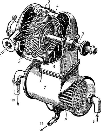 Так работает одноступенчатая турбина. 1 – подвод пара от котла; 2 – направляющие лопатки (сопла); 3 – рабочие лопатки; 4 – диск (ротор), на котором закреплены рабочие лопатки; 5 – вал; 6 – выпускной патрубок; 7 – конденсатор; 8 – подача холодной воды, 9 – охлаждающие пар трубки; 10 – отвод воды охлаждения; 11 – отвод конденсата.