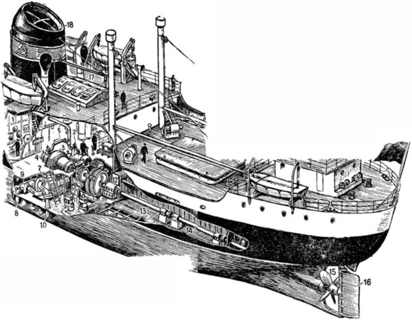 Турбина с зубчатым редуктором вращает винт парохода. 1 – котел: 2 – турбина высокого давления; 3 – турбина низкого давления; 4 – турбина заднего хода (на одном валу с турбиной низкого давления); 5 – главный паропровод; 6 – зубчатый редуктор; 7 – конденсатор; 8 – подача забортной воды для конденсатора, 9 – циркуляционный насос; 10 – отвод забортной воды; 11 – вспомогательные турбонасосы; 12 – упорный подшипник; 13 и 14 – промежуточные валы; 15 – гребной винт; 16 – руль; 17 – машинный люк; 18 – дымовая труба.
