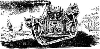 И вот в 1875 году был спущен на воду невиданный пароход «Бессемер». Внешне он особенно не отличался от других пароходов. Зато его внутренность изумляла всех. В средней части судна был выгорожен огромнейший «ящик». В нем размещались все пассажирские помещения. «Ящик» не составлял одного целого с корпусом парохода. Он как бы вставлялся внутрь судна и подвешивался на осях к раме, накрепко соединенной с корпусом.
