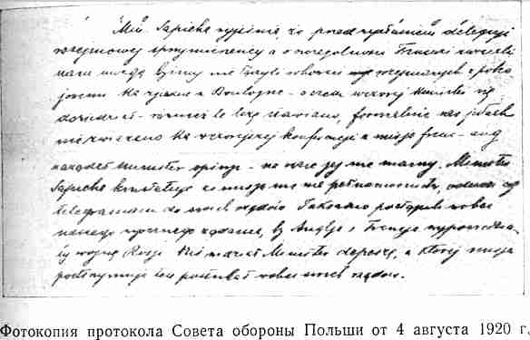 «…помощь Антанты будет заключаться: 1) в моральной поддержке; 2) в помощи оружием и боеприпасами; 3) в помощи летными средствами; 4) в присылке офицеров».18 После дебатов, касавшихся в основном защиты Варшавы, Совет обороны принял к сведению заявление польского главного командования относительно посылки им делегации для переговоров о перемирии с представителями Советской республики.