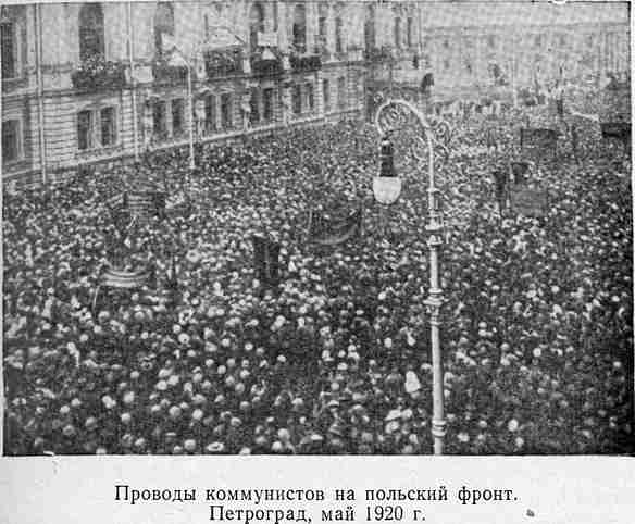 С огромным подъемом проходила мобилизация коммунистов в петроградской партийной организации. Уже к 4 мая 1920 г. на призывные пункты явилось 360 коммунистов.38 Бюро Петроградского комитета РКП(б) 3 мая 1920 г. постановило организовать торжественные проводы мобилизованных коммунистов на Западный фронт.39 На следующий день вечером состоялся митинг, посвященный проводам на фронт первого отряда коммунистов. Митинг превратился в мощную демонстрацию трудящихся Петрограда. К 7 часам вечера на Проспект 25-го Октября подошли с музыкой и пением революционных песен стройные колонны рабочих, работниц, трудовой интеллигенции, учащихся, красноармейские и морские части.