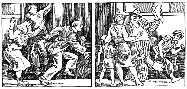 Голод привел меня на верхнюю палубу, к бочонкам с живицей и корзинам, обшитым сверху тонкой материей. Возле корзин крупными деловыми шагами ходила женщина в мужских сапогах. Я уже кое-что знал о корзинах и Митрохе. Он всю ночь провел на палубе возле корзин и теперь спал на знакомых вам мешках.