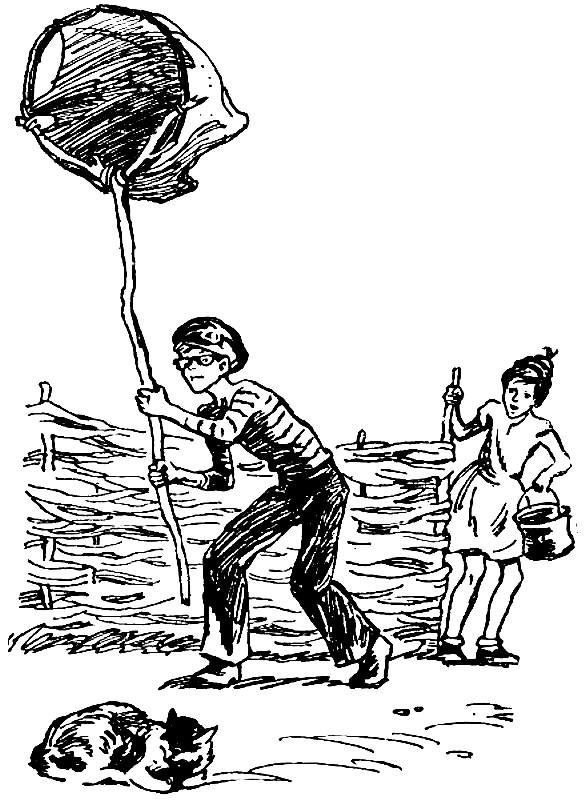 Кеша раздобыл в кладовке прочный пеньковый мешок, приделал к нему обруч от старой кадушки, длинный шест и, полный новых надежд, снова отправился с Тоней на промысел.