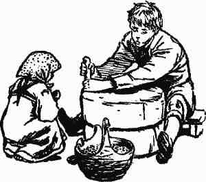 Темнело рано. Дети долго рассказывали сказки, потом укладывались спать. Шумел ветер в лесу. Женщины чинили одежду при свете лучины.